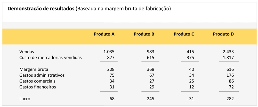 A existência de decisões como as resenhadas até agora apresenta o contraste entre a margem de contribuição e o conceito mais clássico de margem bruta, e suas implicações para o formato da demonstração de resultados.