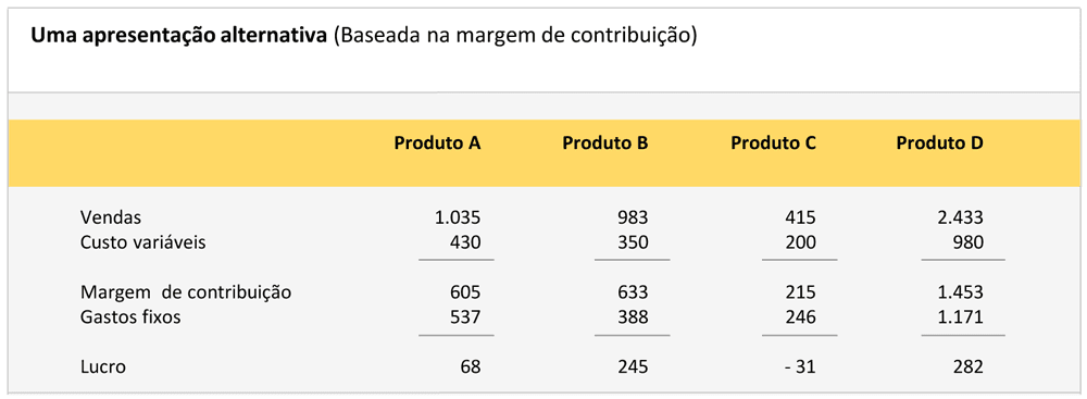 A apresentação do demonstrativo, embora não seja incorreta, tem a desvantagem de ao não mostrar a margem de contribuição, poder induzir ao erro de crer que o produto C deva ser eliminado pelas perdas a que dá origem; uma apresentação em que a margem de contribuição aparecesse explicitamente teria, pelo contrário, a virtude de pôr em evidência que a possível eliminação do produto proporcionaria um lucro inferior ao atual, precisamente em tal margem de contribuição, como se percebe no quadro “Uma apresentação alternativa“.