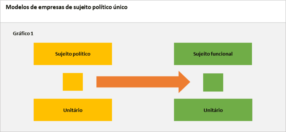 Isto quer dizer que frente aos “Modelos de empresa de sujeito político único“, como se visualiza no gráfico do mesmo nome, não necessitam de processo algum de reconversão; a unidade funcional de gestão – unidade final – já era unidade de interesse – unidade de origem.