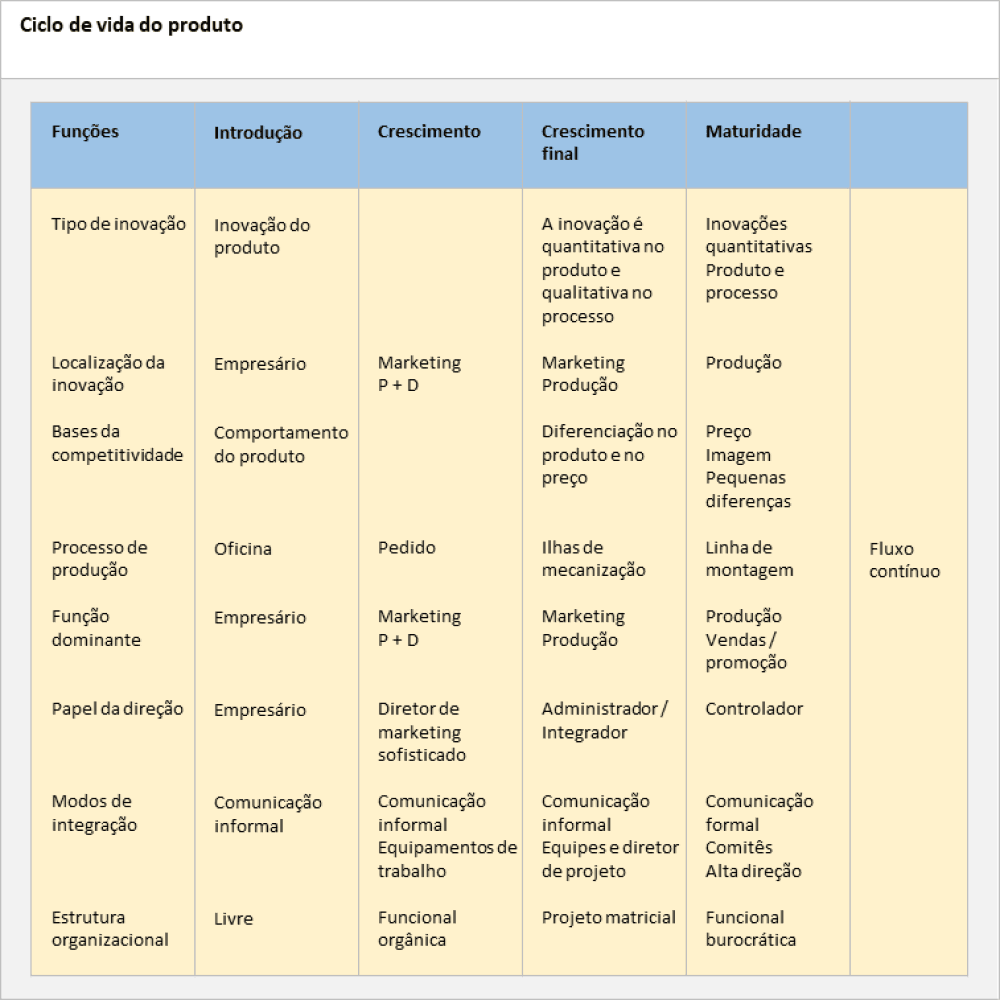 No quadro “Ciclo de vida do produto” são analisados os tipos de inovação, o ponto onde esta se concentra dentro das empresas, em que se baseia, o tipo de processo que utiliza, a função dominante e a que o diretor desempenha, a maneira como se consegue a integração e a estrutura organizativa idônea para cada uma das fases.