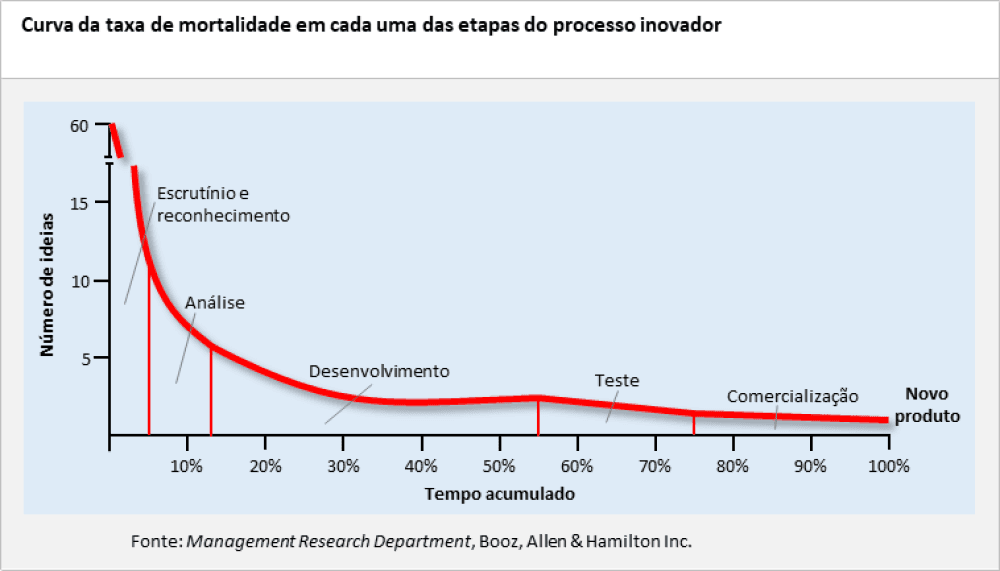 O gráfico apresenta claramente o resultado dos estudos realizados por Booz, Allen e Hamilton sobre a complexidade do processo de inovação do ponto de vista empresarial. Embora a taxa de mortalidade possa variar entre as indústrias e, sobretudo, entre as empresas, pode-se dizer que, em média, de cada 60 ideias prometedoras, somente uma chega à etapa final.