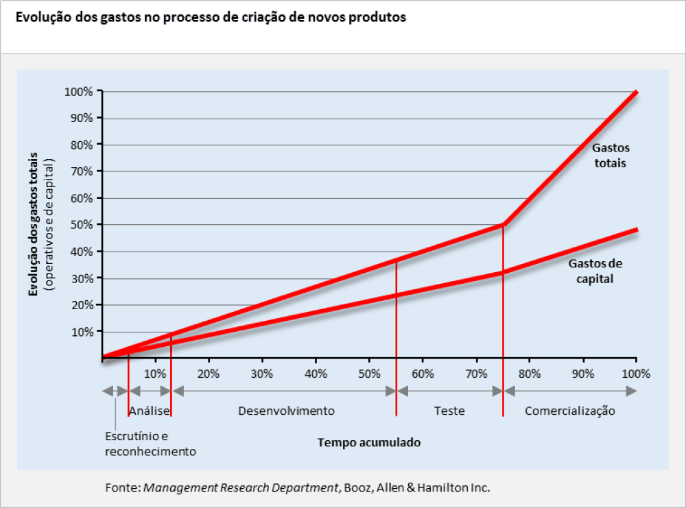 A figura “Evolução dos gastos no processo de criação de novos produtos” apresenta os gastos efetuados no tempo e baseia-se em uma amostra de várias empresas líderes, analisada também pela Booz, Allen e Hamilton.