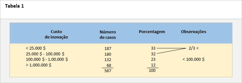 A “Tabela 1” mostra que as inovações de caráter incremental e pouco custosas podem contribuir de maneira significativa para o êxito comercial da empresa.
