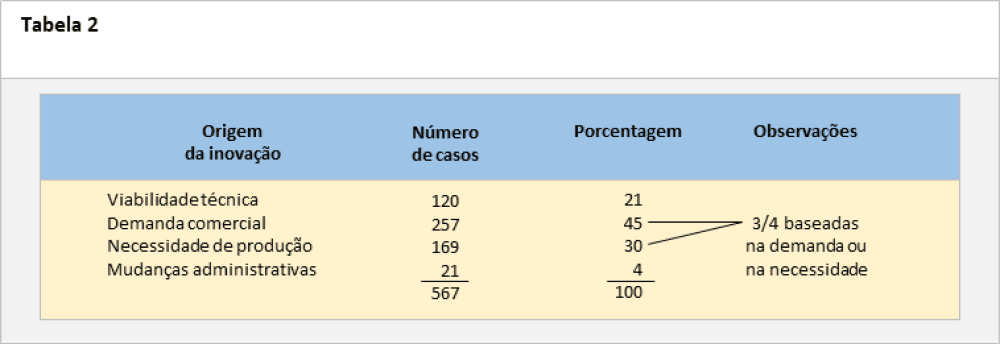 Já a “Tabela 2” mostra que o reconhecimento da demanda é uma fonte de inovação mais comum do que o reconhecimento da viabilidade tecnológica.