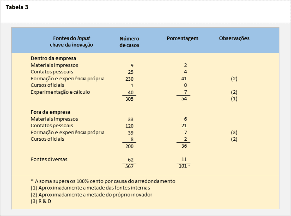 Mediante a “Tabela 3” deduz-se que o treinamento e a experiência do pessoal na própria empresa são as principais fontes de informação para as inovações que tiveram êxito.
