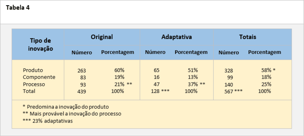 Enquanto a “Tabela 4” indica a necessidade de não desprezar inovações imitativas: contribuem para a obtenção dos êxitos econômicos d; empresas.