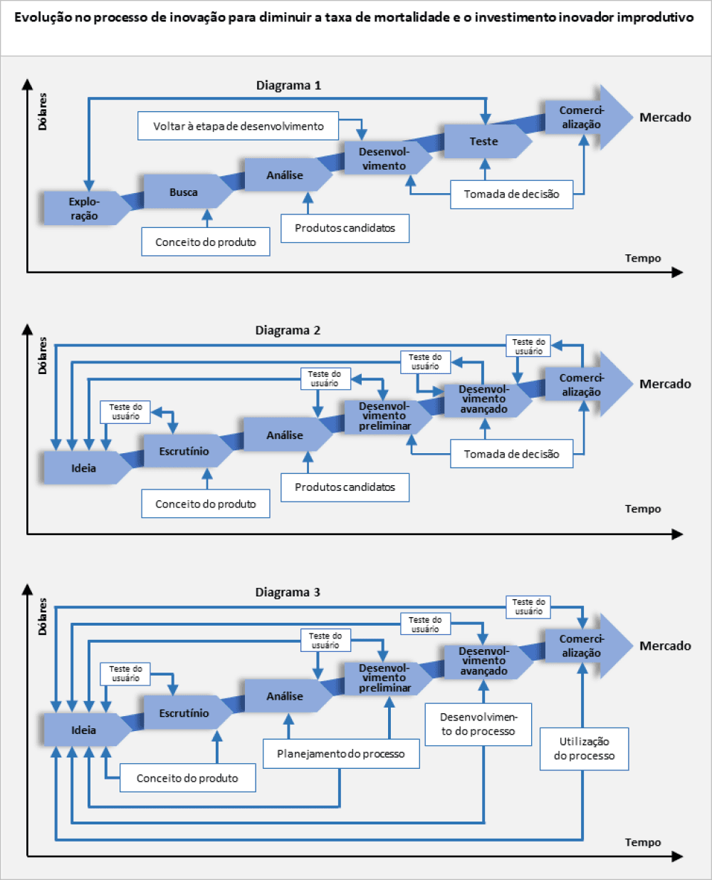 O processo está apresentado nos três diagramas da figura “Evolução no processo da inovação para diminuir a taxa de mortalidade e o investimento inovador improdutivo”.
