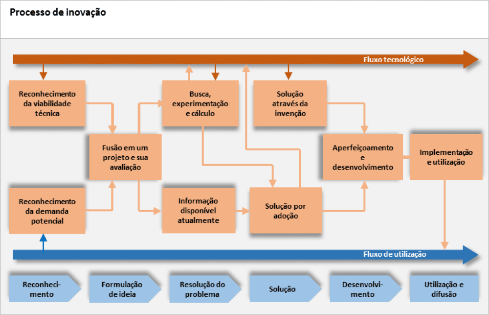 O diagrama da figura oferece um modelo no qual aparecem perfeitamente diferenciadas as etapas necessárias à realização de uma inovação, assim como aquelas atividades típicas principais que devem ser levadas a termo em cada uma dessas etapas. Na figura há duas fontes de ideias: as de origem tecnológica e as que identificam necessidades não satisfeitas. A inovação baseia-se em ambas.