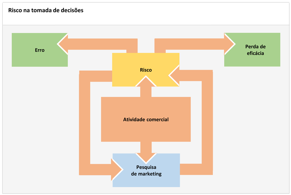 O gráfico mostra as implicações do risco no campo da pesquisa de marketing. A atividade comercial supõe a tomada de decisões que sempre incluem um risco de perda de eficácia ou de erro. O valor dessa pesquisa está na sua capacidade de desempenhar a função de seguro, cobrindo o risco eventual, embora de forma parcial, à maneira de um seguro com franquia.